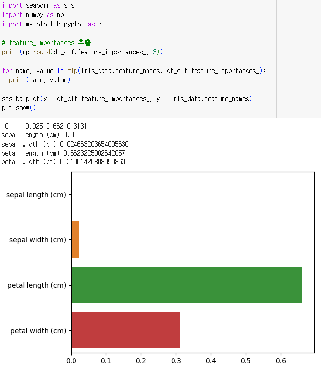 - 물론 시각화에서 보다시피 petal length 와 petal width 가 분류모형에서는 중요한 피처라는 것을 짐작할 수 있다. 하지만 좀 더 정확하고 수치적으로 중요한 피처를 알아볼 수 있는 좋은 메서드가 DecisionTreeClassifier에 제공된다.